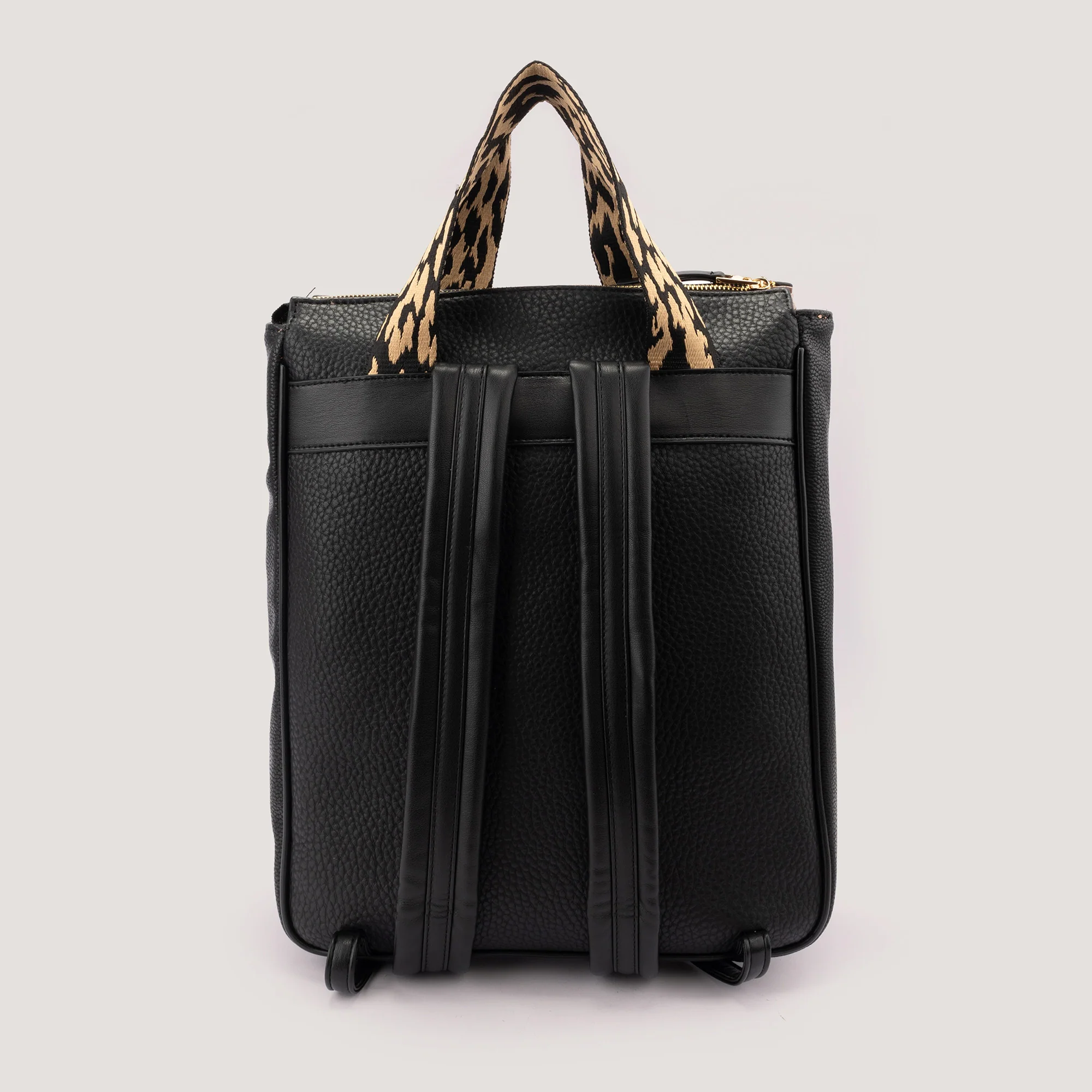 Stylish and spacious, the Effie backpack is perfect for everything from scenic city breaks to the daily commute. Crafted from premium black faux leather, it features a pair of leopard-print webbing grab handles and adjustable padded straps for all-day comfort. It is perfectly sized to hold a laptop and has a number of pockets to organise your essentials.